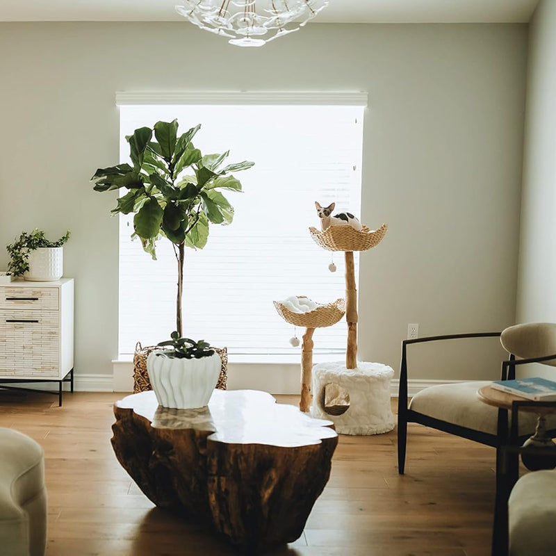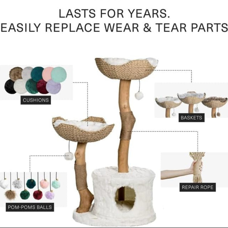 - Aesthetic Design & Unique Cat Tree: PISARRY modern cat furniture for indoor cats exudes elegance and beauty, standing out as a piece of art in your home, unlike most cat trees. Perched on top of the solid wood trunks are two handcrafted rattan baskets. Inside these baskets, two cozy cushions await, providing your cute cat friend with a delightful spot to rest and unwind