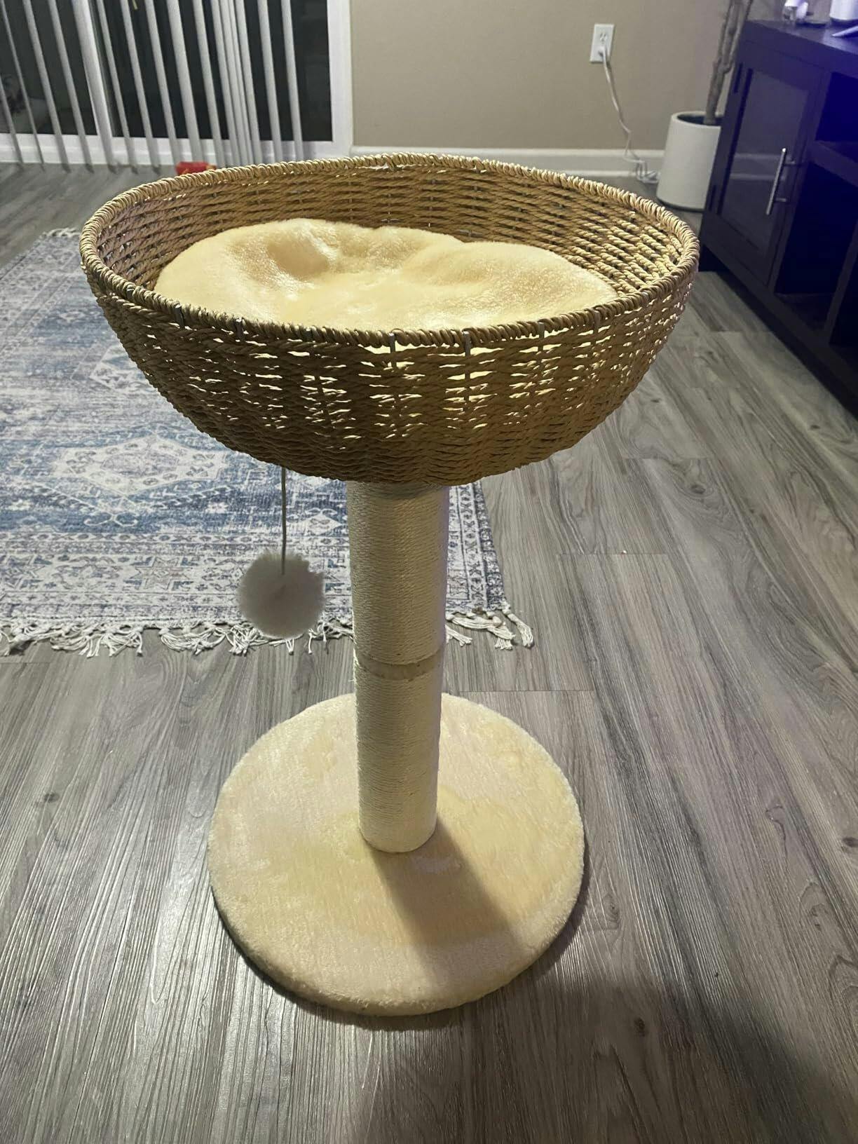 - 【 ALL-IN-SPOT】A cozy basket beds for taking a nap, and the sisal rope scratching post grant relief for those sharp claws and avoid damage to your furniture, while the little fluffy pompom will offer endless fun for your playful kitty.