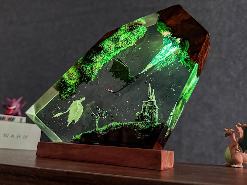 * ARTISTIC DISPLAY: Unique angular design showcases a fantasy-inspired diorama scene within clear resin, making it both a lamp and art piece