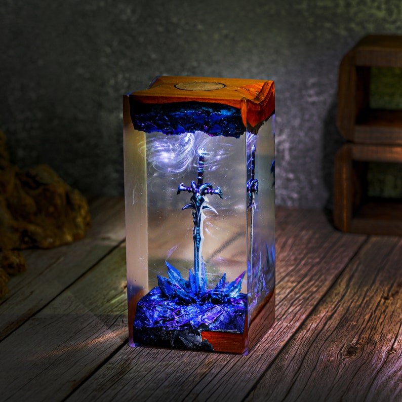 This Frostmourne Sword night light is crafted from wood and resin, capturing the iconic blade in stunning detail. It emits a soft, icy blue glow, perfect for adding a touch of fantasy to any space. Compact and USB-powered, it's a must-have for fans and collectors alike.