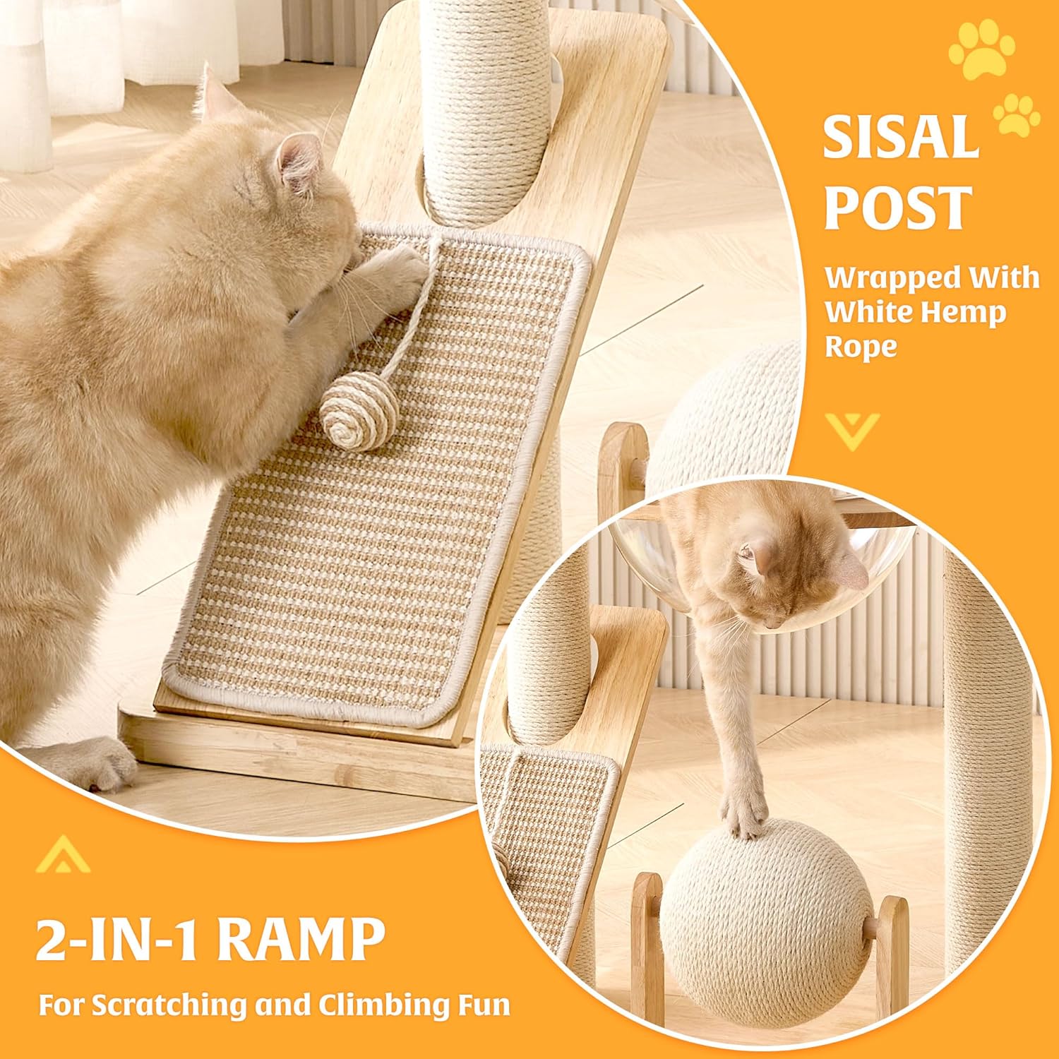 - 【Premium Material, Effortless Cleaning】This wooden cat tree is crafted from rubberwood with a water-resistant finish, ensuring durability and ease of maintenance. The scratching posts are wrapped with white sisal rope, providing a reliable and long-lasting play area for your feline friend.