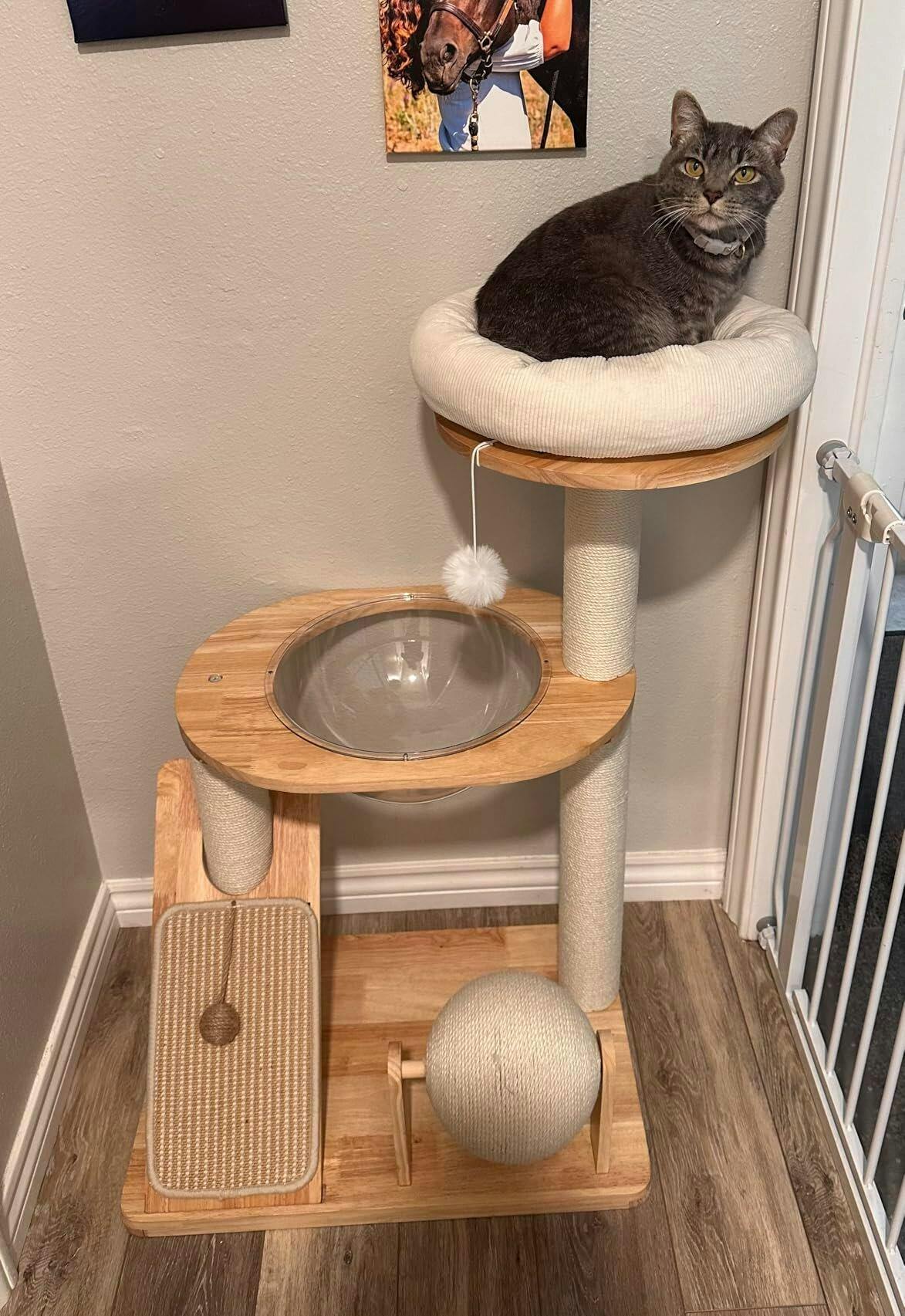 - 【4-in-One Design】Solid Wood Cat Tree Tower With a total height of 37.8 inches, this small cat tower is perfect for cats who love to climb up and down.Your cat can sleep in the spacious space capsule or jump to the top perch. Scratching, climbing, sleeping and exercise needs are all fully met!