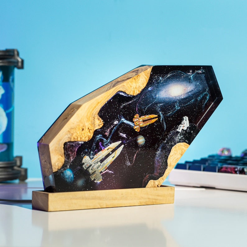 SPACESHIPS & ASTRONAUT in INTERSTELLAR Resin Lamp, Galaxy Space Resin and Wood Epoxy Lamp, Spacecraft Custom Night Light