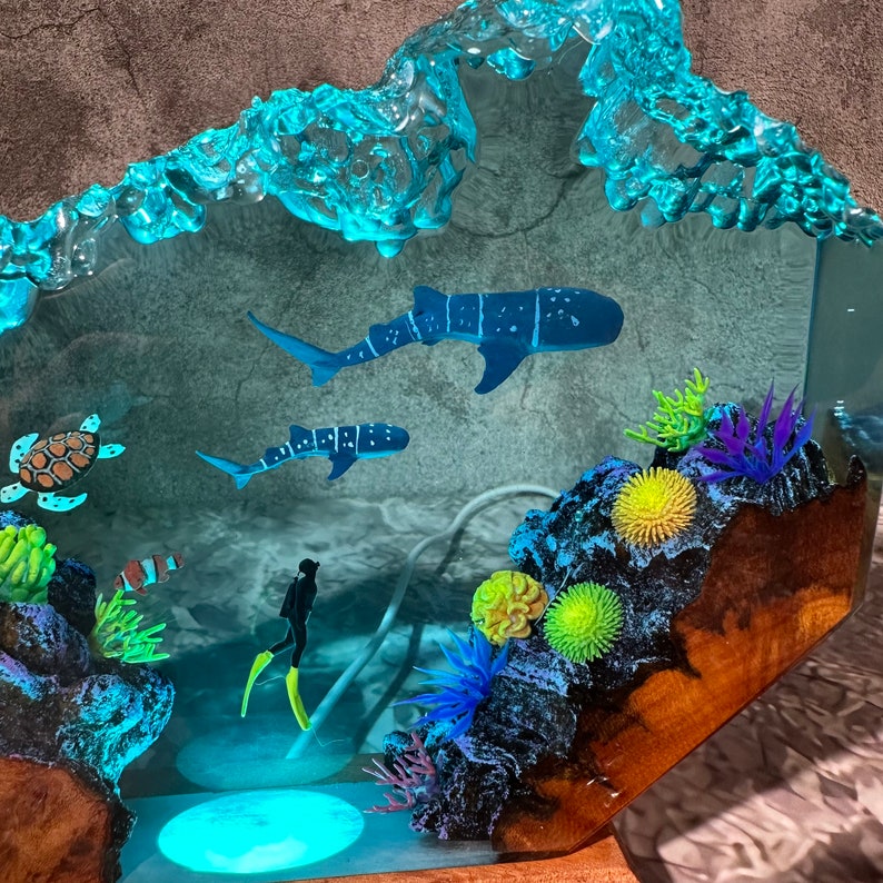 This resin night lamp is for those who love the sea, whale sharks, and true art. The lamp is meticulously crafted through 15 careful steps: wood cutting, sawing, glue mixing, coloring, animal attachment, glue pouring, sanding, paint spraying, and more. Each step is executed by skilled hands, guided by aesthetic sense and a passionate heart.