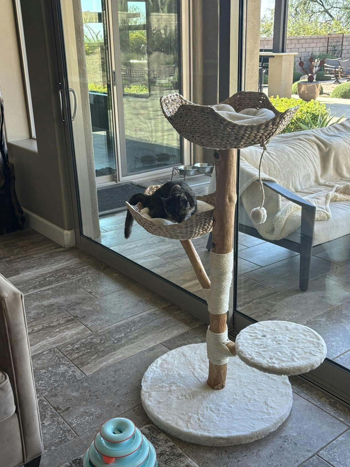 - 🧶Sisal-Wrapped Scratching Post & Handwoven Rattan Nest The trunk of the cat tree is wrapped in natural sisal rope, offering a perfect spot for your cat to scratch freely. The cozy nests are handwoven from virgin pulp paper, creating a natural rattan texture that not only serves as a comfortable resting place but also emits a gentle, earthy scent. (Cat tip: Felines love the scent of nature—bring them a leaf from outside and watch them light up with joy!)